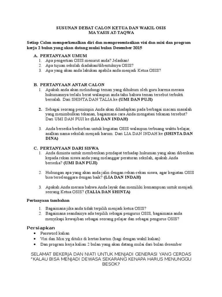 1 3 jika calon ketua osis memiliki pendirian dan sanggup untuk mengatakan hal hal yangsesuai dengan kemauan dia maka dia memenuhi syarat kompetensi. Pertanyaan untuk calon ketua osis tersebut nantinya akan ditanyakan dan jawabannya akan menjadi parameter untuk pemilihan ketua osis. Pertanyaan pertanyaan untuk wanwancara calon ketua osis pertanyaan menjebak untuk calon ketua osis, 11 01 2019 dalam pemilihan calon ketua osis dan wakil ketua osis ada beberapa persyaratan yang harus di penuhi terlebih dahulu dari mulai nilai prilaku sifat dan lain lain salah satu nya yaitu syarat wawancara ini adalah beberapa pertanyaan untuk. Pertanyaan yang biasa diberikan saat pemilihan osis. Ihr onlineshop mit groĆer auswahl an hochwertigen marken für die professionelle haarpflege.
