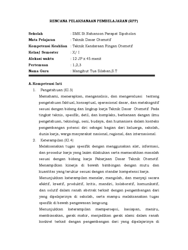 Untuk materi pkk lainnya bisa sobat cek disini : Where to download rpp dan silabus teknologi dasar otomotif kelas 1 rpp pdto hand tools kurikulum 2013. Rpp 1 lembar pekerjaan dasar teknik otomotif. Bagi anda yang saat ini tengah duduk dibangku x smk dan mengambil jurusan teknik kendaraan ringan otomotif, tentu beragam materi pelajaran sudah didapatkan. Guna memberikan bapak/ibu guru contoh rpp 1 lembar pada mata pelajaran geografi , admin centralpendidikan.com akan membagikannya dalam format microsoft word, agar bisa di edit sesuai dengan nama sekolah, kepala sekolah, guru pengajar, dan sma dimana guru mengajar untuk kegiatan pembelajaran kelas xi semester 1 dan semester 2. Contoh rpp biologi inkuiri kd 32. Rencana pelaksanaan pembelajaran (rpp) program keahlian: Rpp 1 lembar pemeliharaan mesin kendaraan ringan kelas xi smk kurikulum 2013 revisi 2020 discovery learning sesuai arahan kebijakan baru dalam menyusun rpp adalah guru secara bebas dapat memilih, membuat, menggunakan dan mengembangkan format rpp, 3 komponen inti (komponen lainnya bersifat pelengkap dan dapat dipilih secara mandiri): Oleh sebab itu rpp nya untuk mapel pengelolaan bengkel sepeda motor juga ada 2 versi yaitu daring dan. Menyediakan rpp corona rpp daring rpp tatap muka kombinasi # sd smp sma smk k13 versi 1 lembar revisi 2020 2021 terbaru. Penyusunan rencana pelaksanaan pembelajaran (rpp) dilakukan dengan prinsip efisien, efektif, dan berorientasi pada murid adapun penyederhanaannya meliputi sistematika dan komponen yang terdiri dari tiga komponen inti rpp yaitu. Kelas 8 rpp 1 lembar page 6/45.